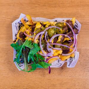 Black angus vlees, sla, rauwkost, jalapenos, rode ui, en heerlijke sriracha mayonaise