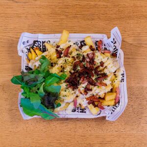 sla, rauwkost, geraspte oude kaas, krokante spekjes, en heerlijke truffelmayonaise